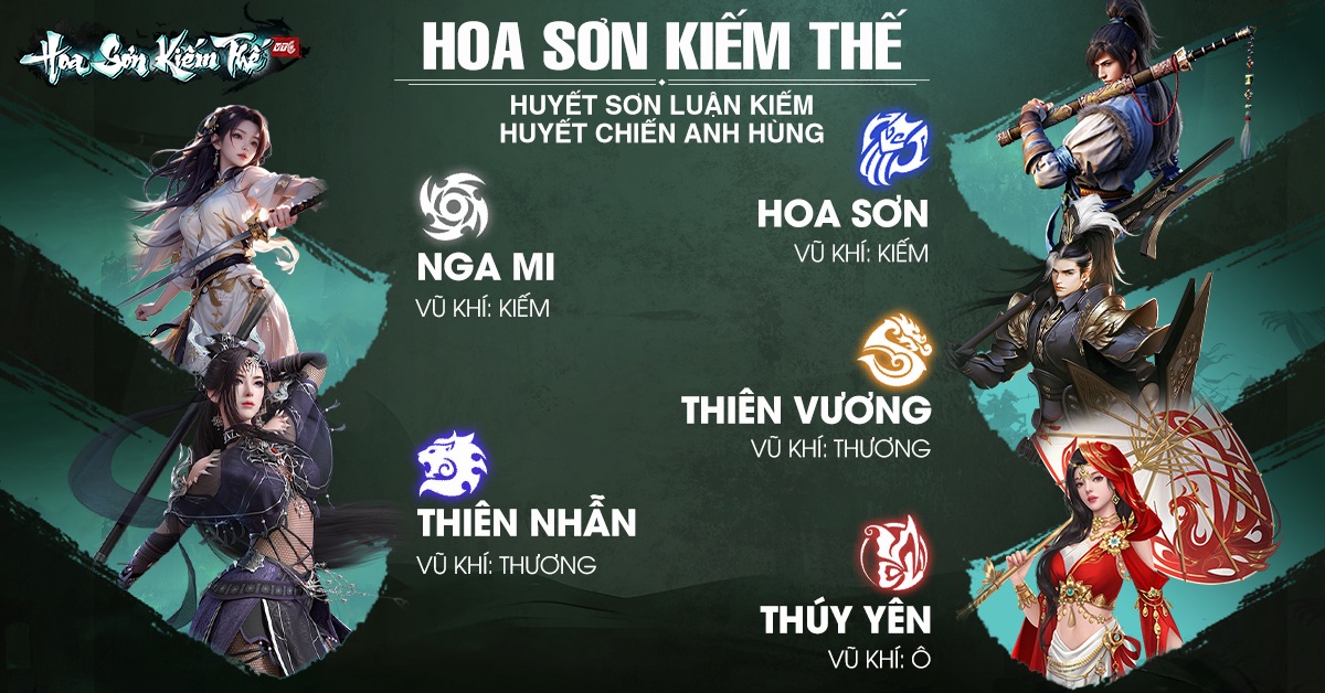 Bước vào Hoa Sơn Kiếm Thế, người chơi sẽ hóa thân thành những cao thủ giang hồ, lựa chọn giữa 5 môn phái quen thuộc: Nga Mi – Thúy Yên – Thiên Vương – Thiên Nhẫn – Hoa Sơn. Mỗi môn phái sở hữu đặc điểm riêng biệt, kết hợp cùng hệ thống ngũ hành tương sinh – tương khắc, tạo nên chiều sâu chiến thuật phong phú, mở ra những trận đấu mãn nhãn, đề cao khả năng tư duy và kỹ năng cá nhân.